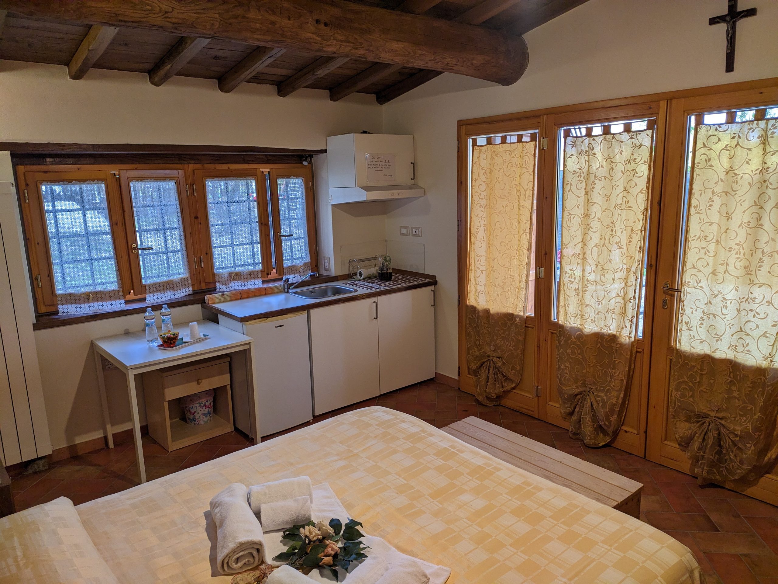 La camera è dotata di piano cottura a induzione, stoviglie, frigorifero e tavolo.